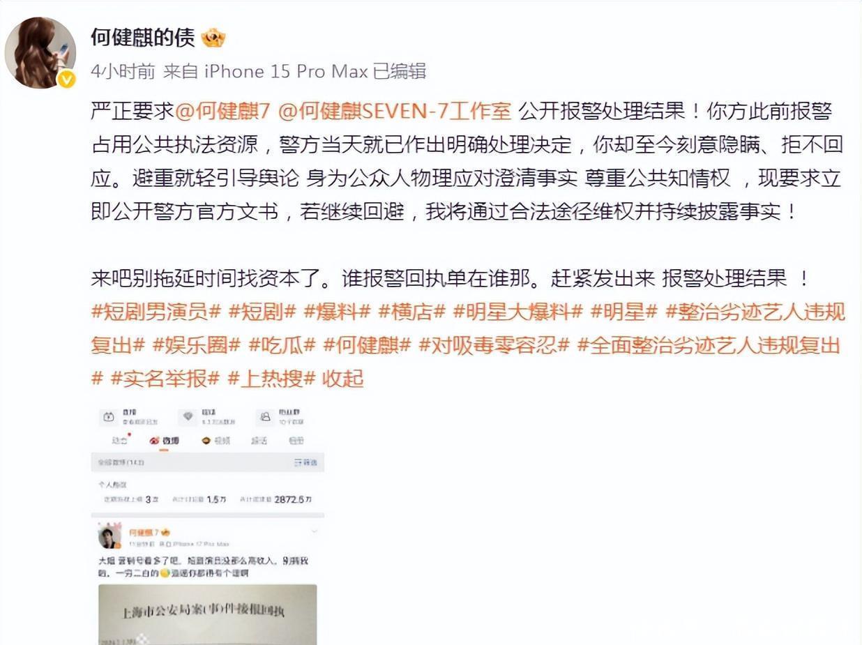 朱女士网名叫何健麒的债!一看这名,就知道他们之间的故事不光有情,还有怨。朱女士的举报内容是:在2021年,何健麒和她同居期间吸毒,被北京警方带走并且留下办案记录。而且私生活混乱……这对于一个演员来说,无异于是一记重击,如果属实,何健麒的演艺生涯恐怕结束了。圈子里注重的不只是演技,更注重人品。虽说这是个人行为,但没有哪个公司会为了劣质艺人带来的影响买单!前有车后有辙,何健麒自然知道严重性,迅速回应称前任说谎,并且报警。