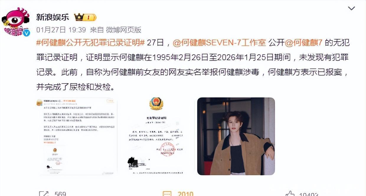 1月26日傍晚,何健麒发文:尿检发检做完,回家吃饭了,不是最近健身还真不够体力辟谣。1月27日,何健麒工作室公开何健麒的无犯罪记录证明,证明显示何健麒在1995年2月26日至2026年1月25日期间,未发现有犯罪记录。何健麟的回应登上热搜,但并未平息舆论。
